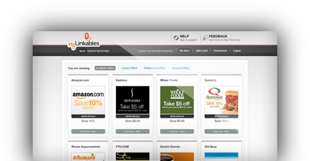 | Offers | The MyLinkables API enables an authenticated entity access to all offer types AVAILABLE (GET: consumerapi/offers/available), LINKED (GET: consumerapi/offers/linked), REDEEMED (GET: consumerapi/offers/redeemed), and RESERVED (GET: consumerapi/offers/reserved). There is a special API endpoint if you just want to display a list of AVAILABLE offers in your mobile application or on your website. |